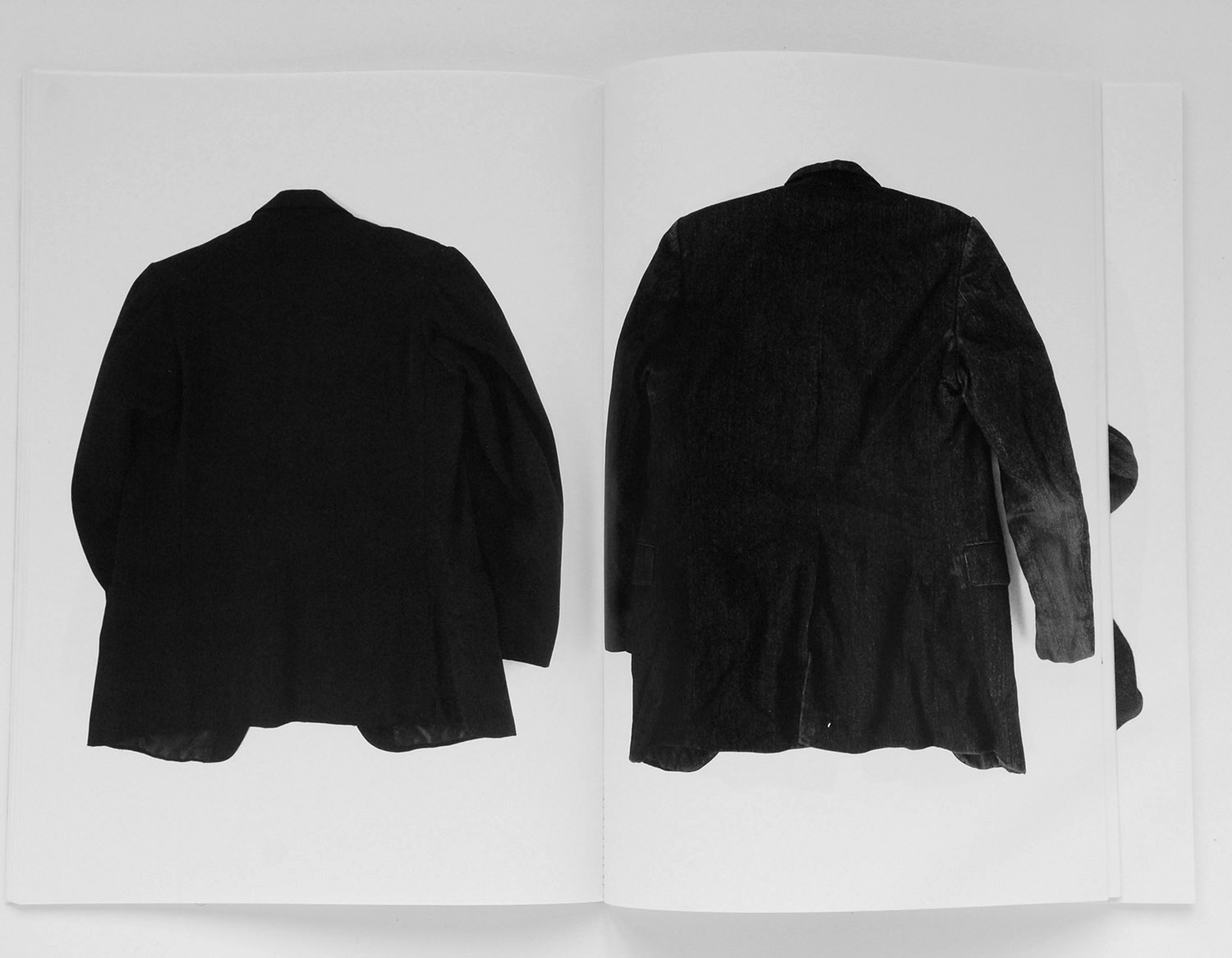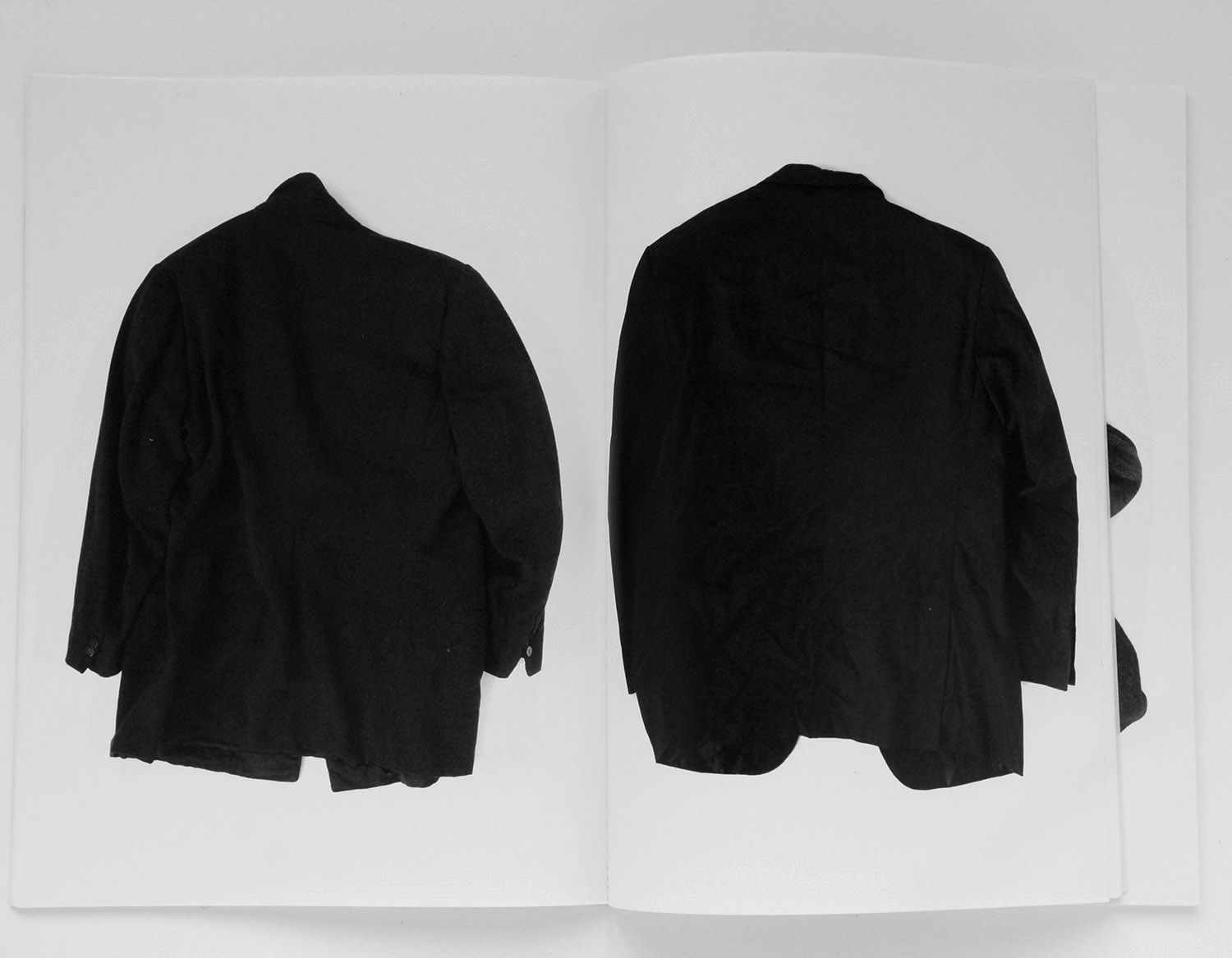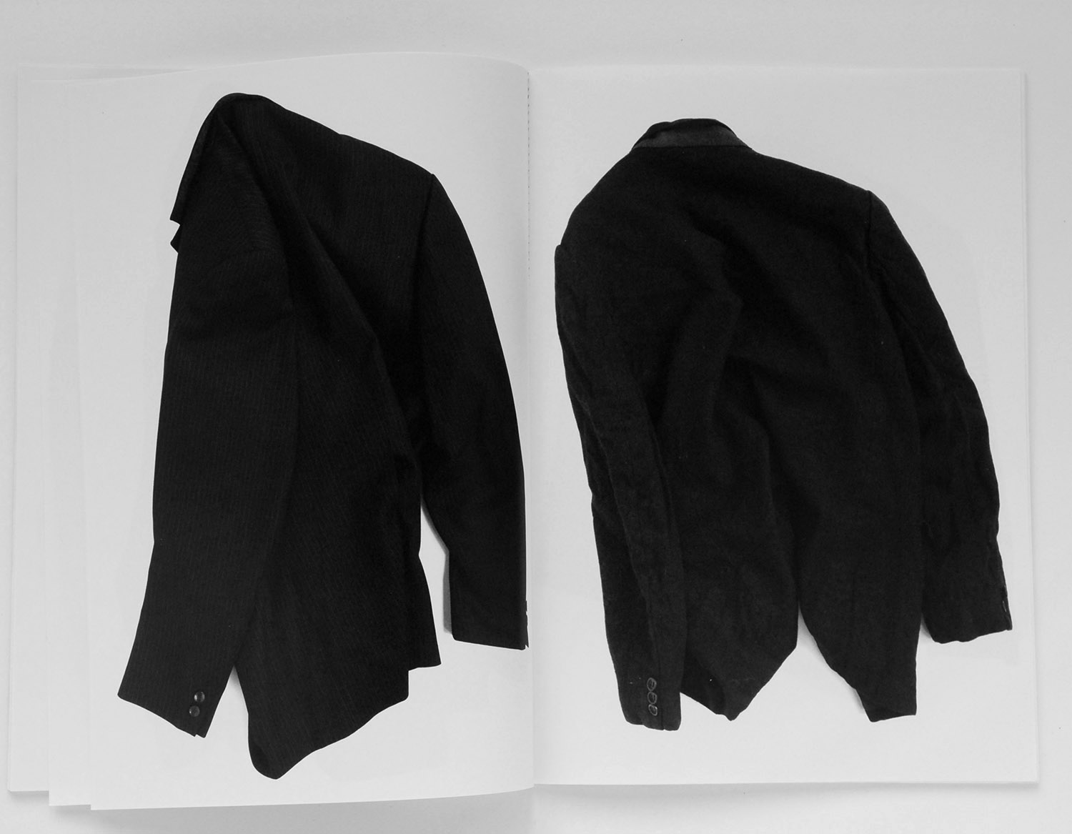 Images de vêtements noirs, plus spécifiquement de vestes de costumes d’homme : posées, tombées, jetées, suspendues, et endossées par des chaises.
